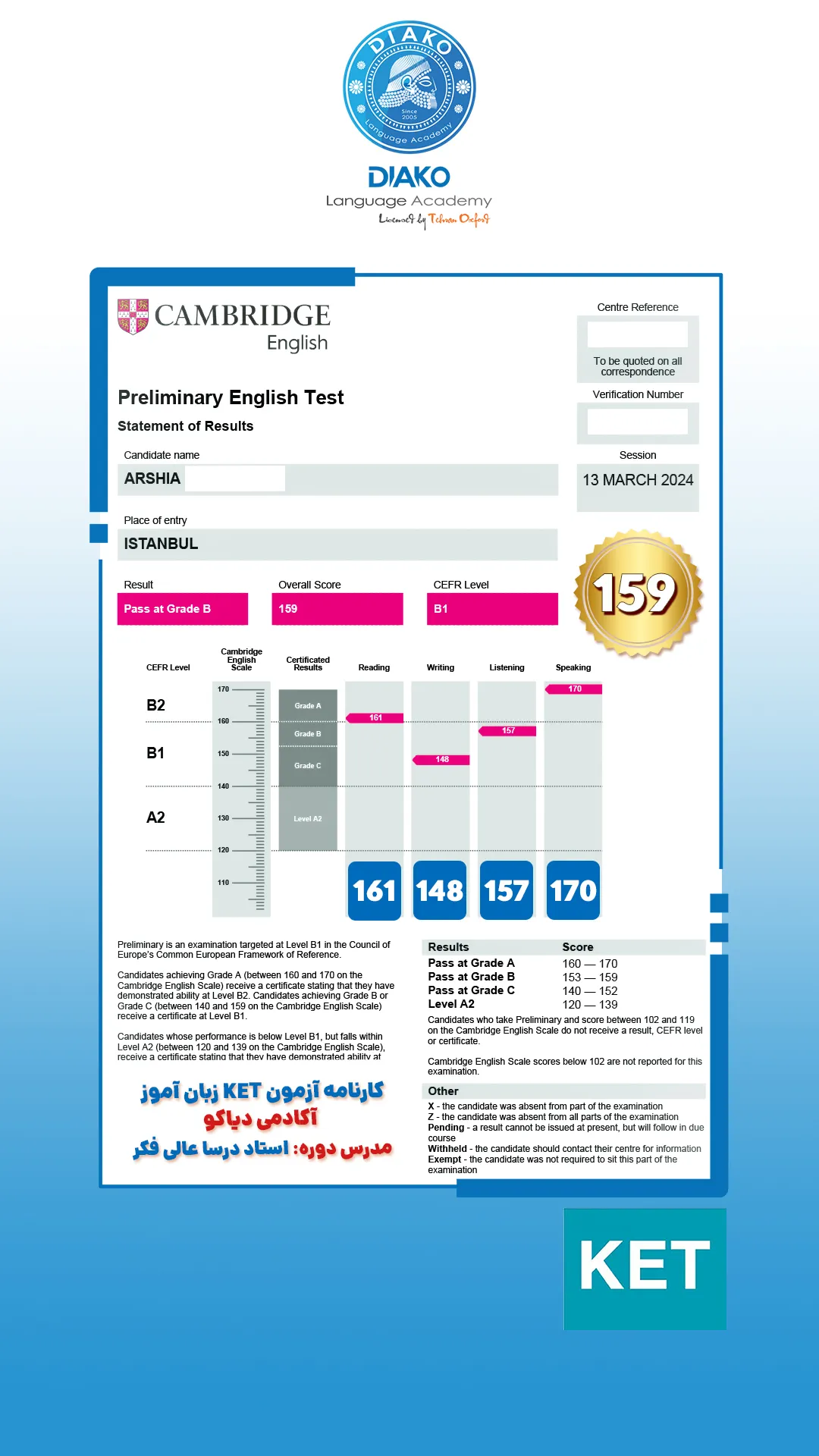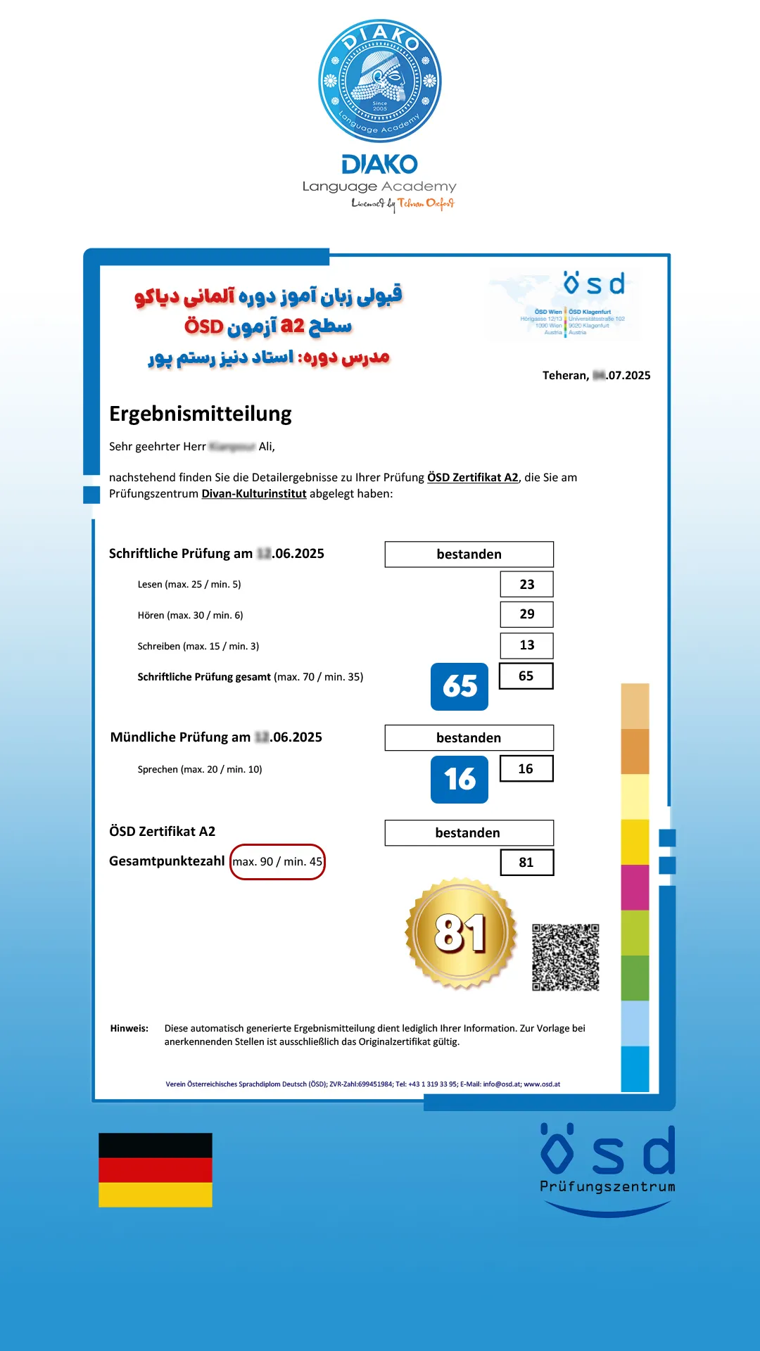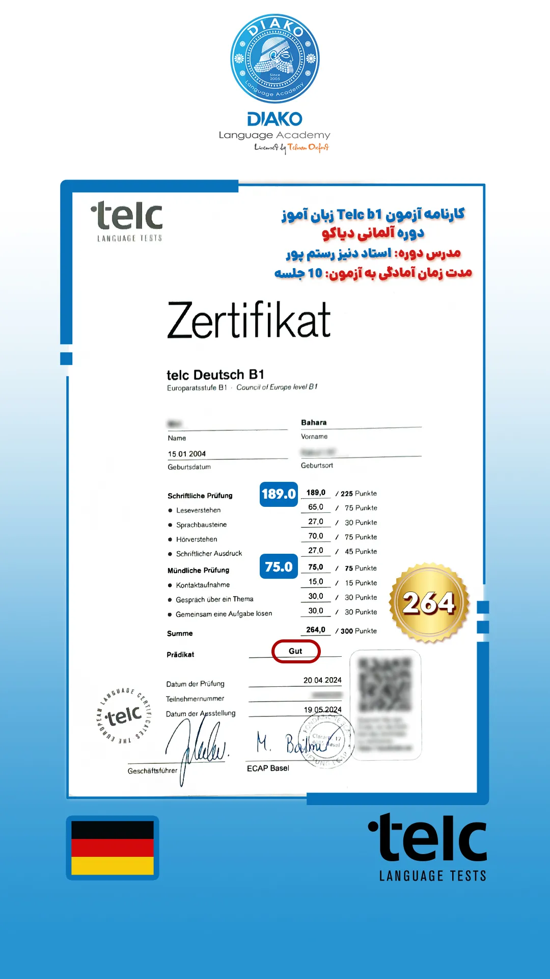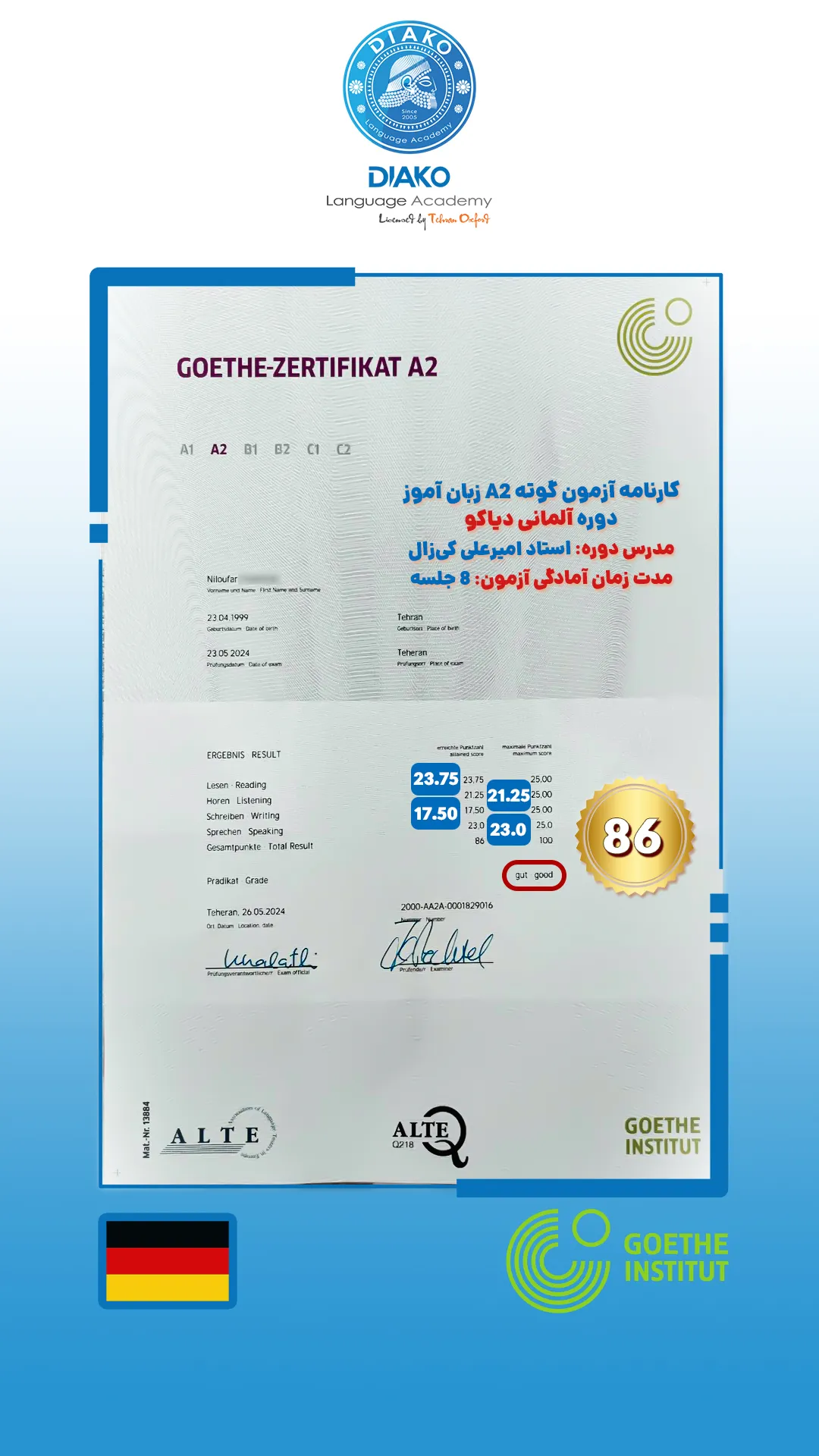 امیر عزیز، سه ماهه کلاس آلمانی میاد و یه ماهه دوره خصوصی دیاکورو هم شروع کرده. حالا تو همین مدت کوتاه به سطح B1 رسیده. پیشنهاد امیر به همه علاقهمندان یادگیری زبان آلمانی، شرکت در کلاسهای دیاکوعه.