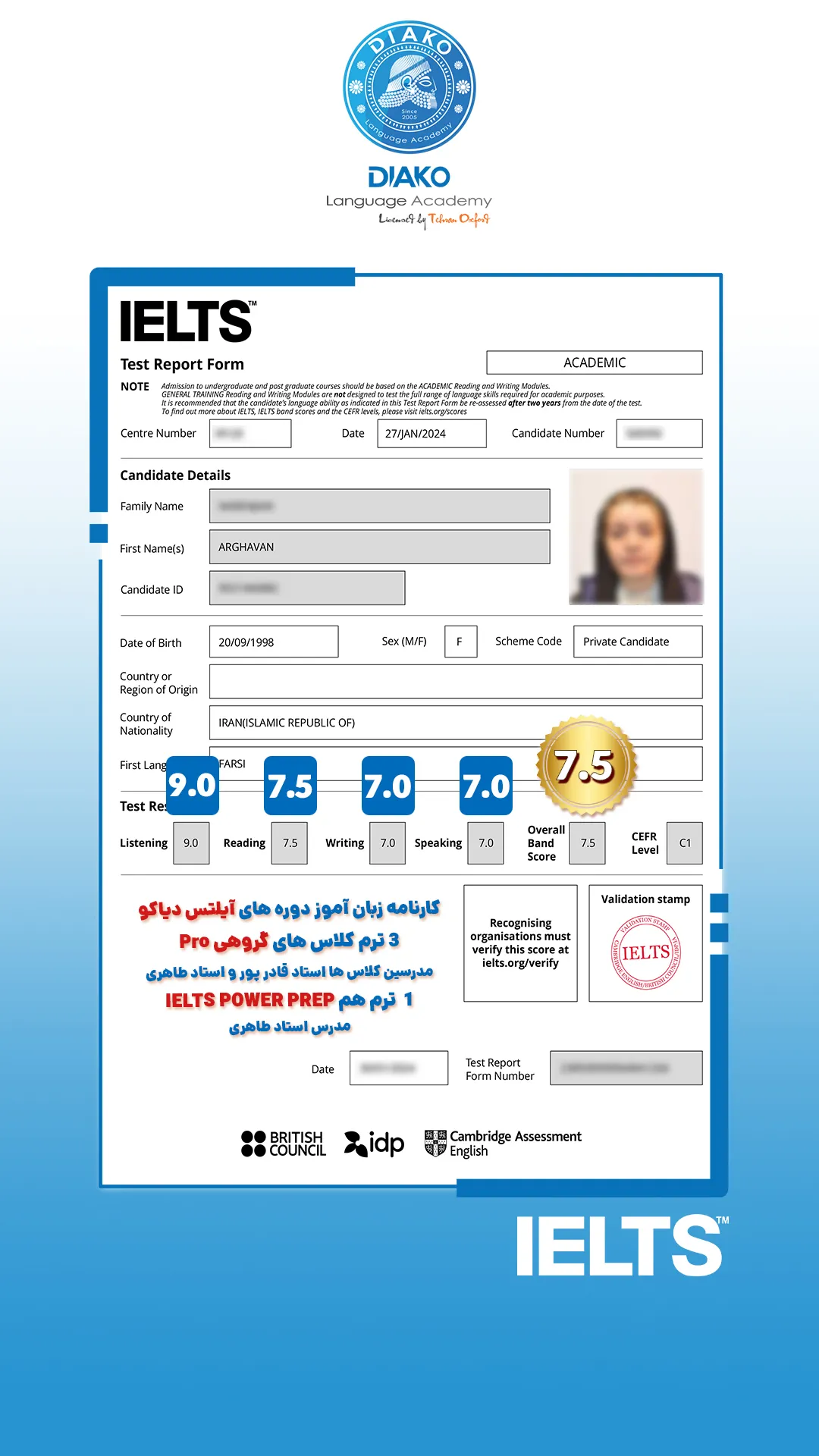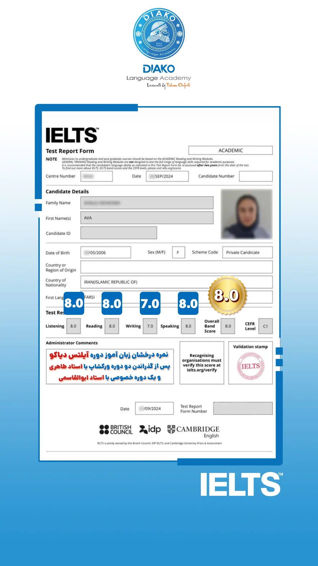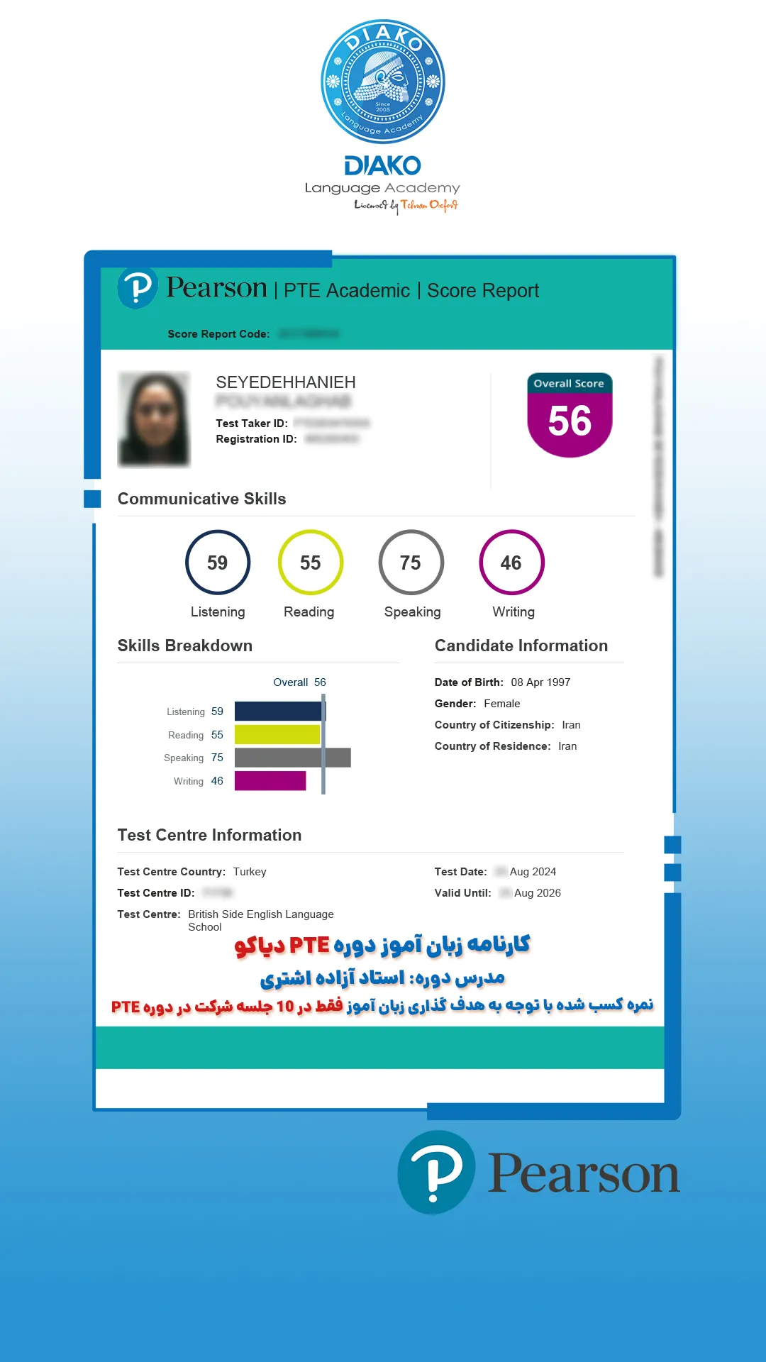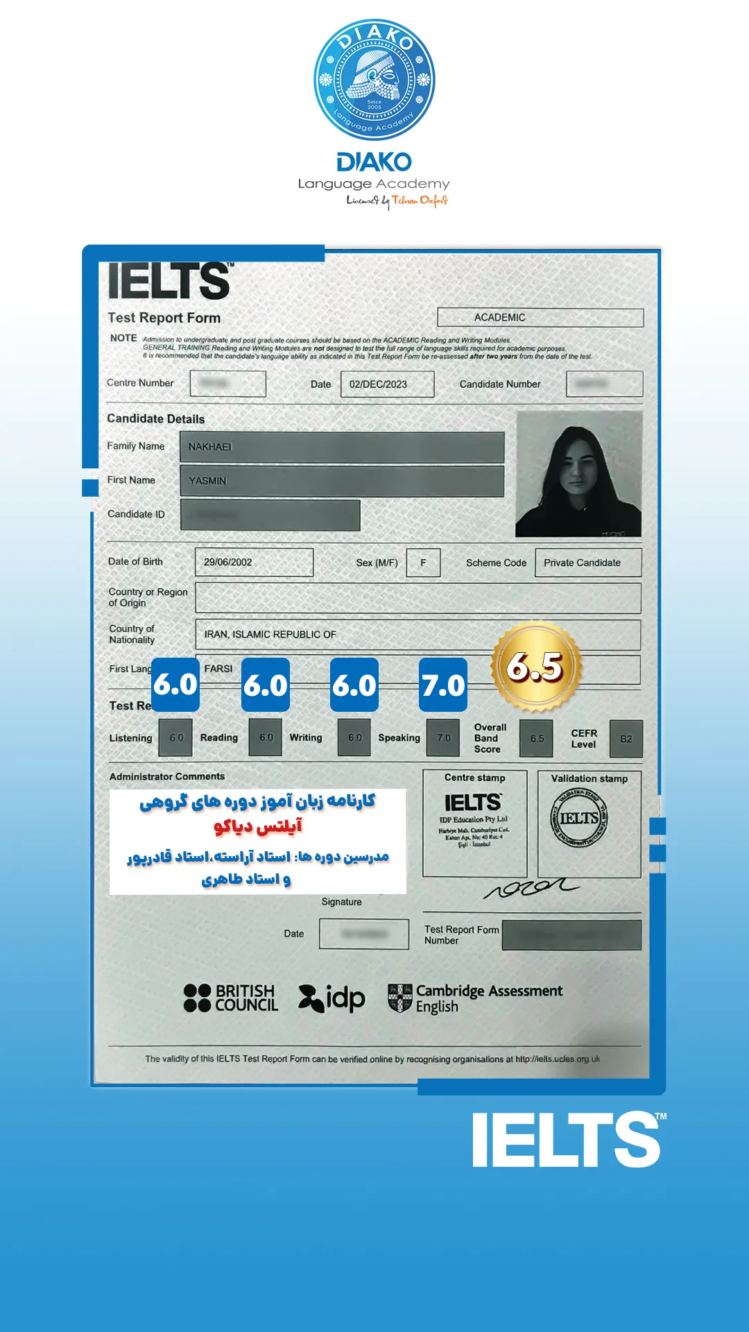 یاسمین عزیز، حدود ۴ ماهه تو کلاسهای آیلتس دیاکو شرکت کرده. کلی راضیه و با انگیزه داره برای آزمون آماده میشه. اون میگه که ورکشاپها روی هر 4 مهارت آیلتس تمرکز دارن.
