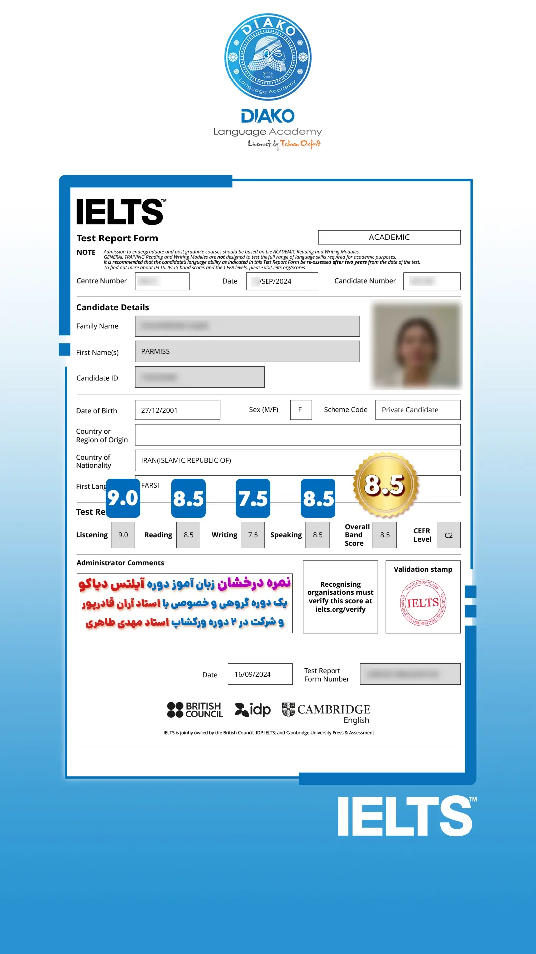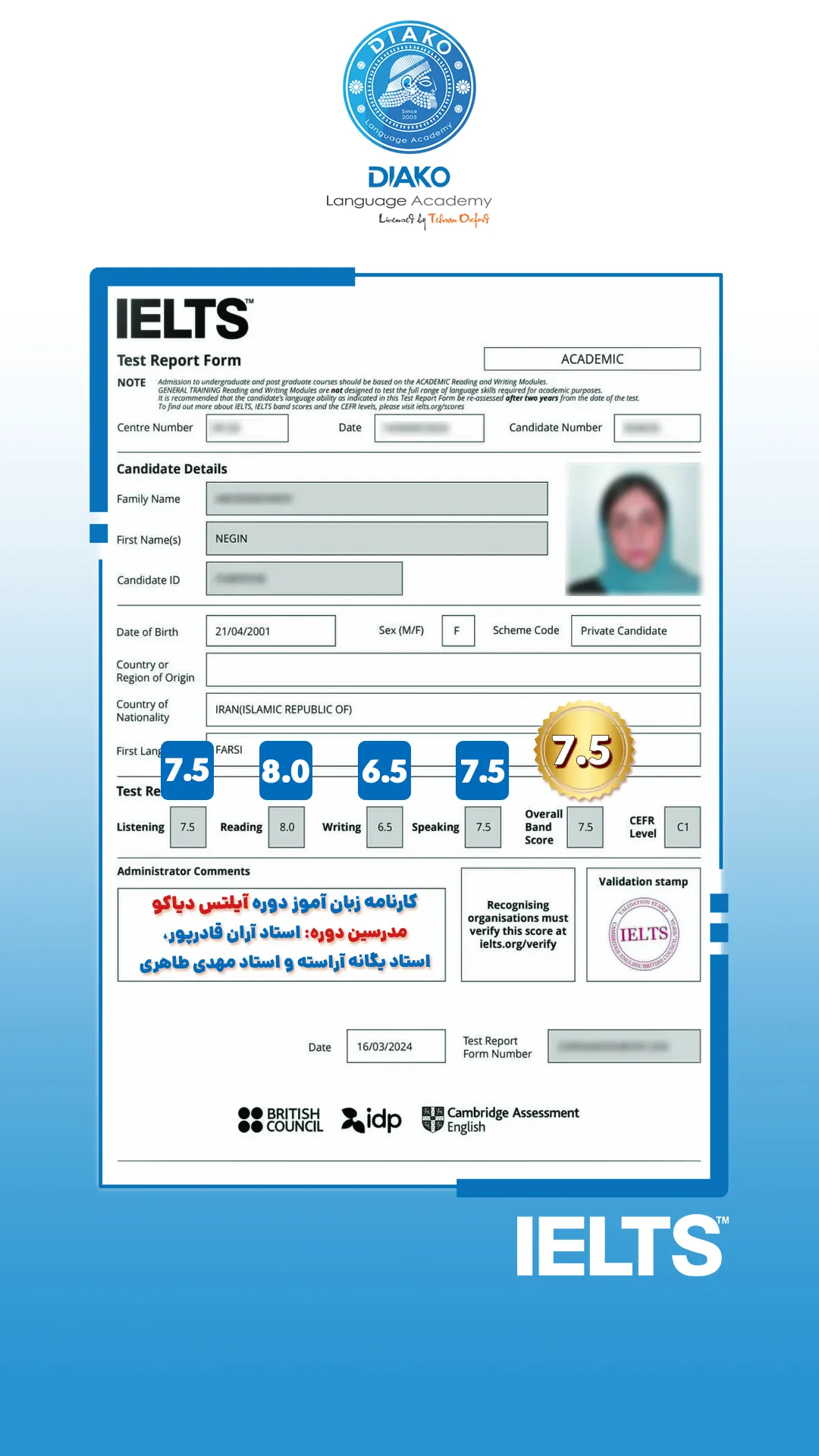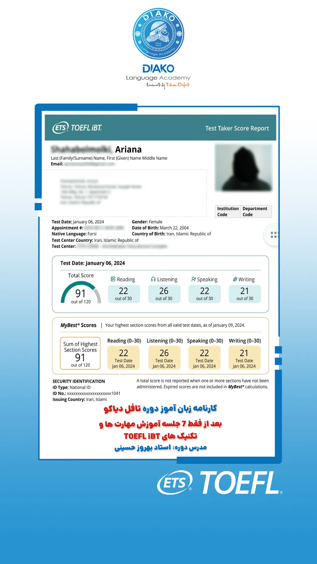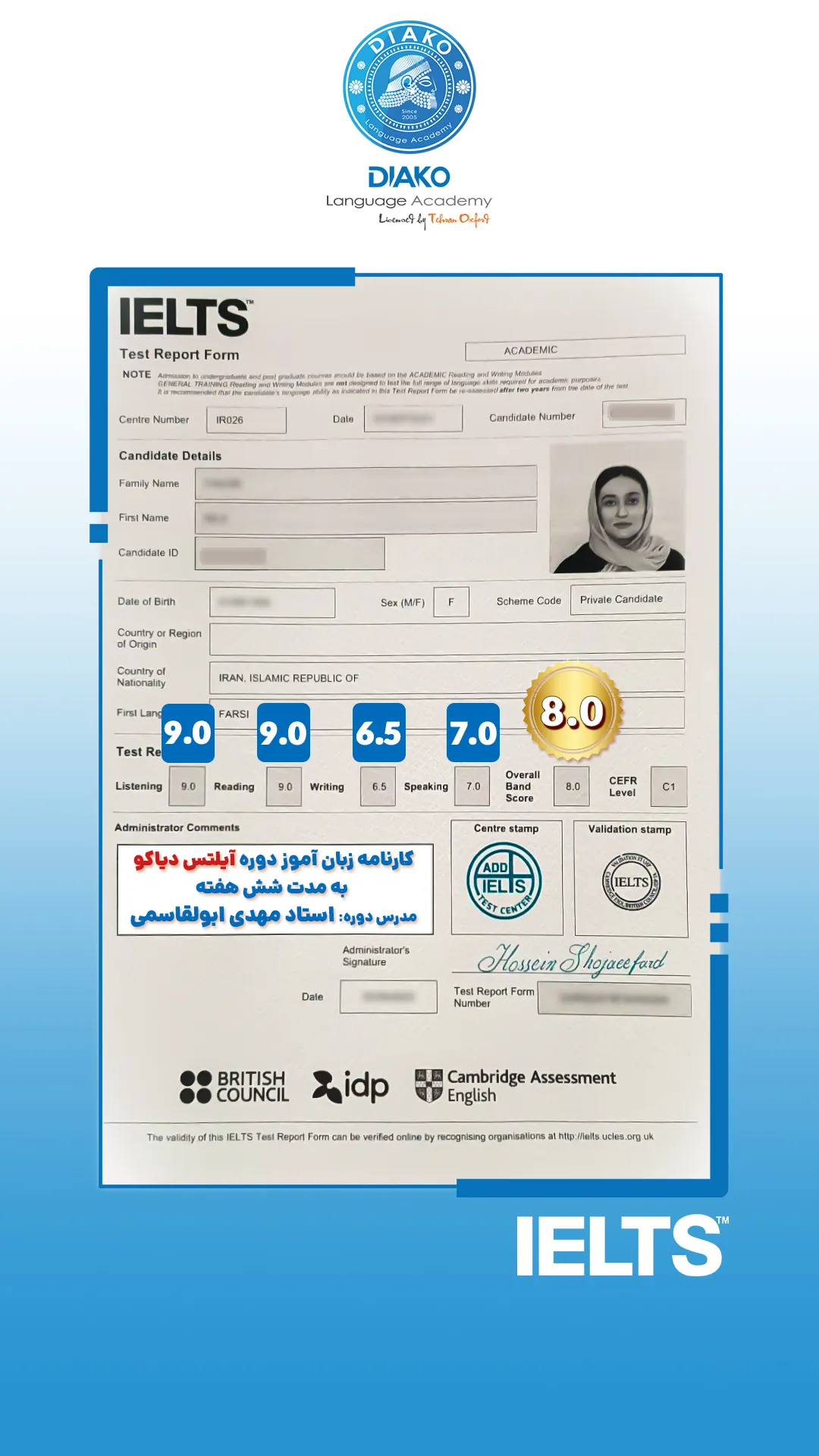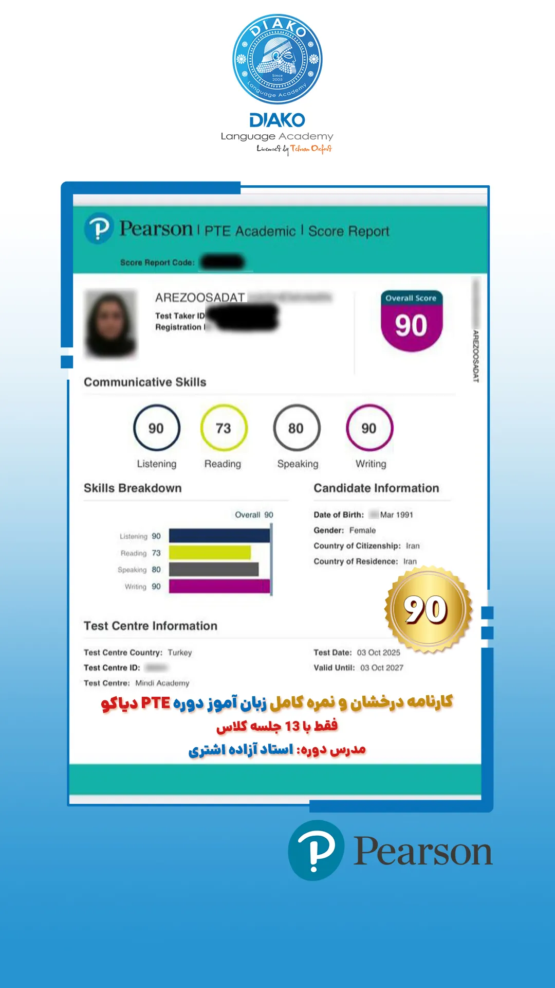 یاسمین عزیز، حدود ۴ ماهه تو کلاسهای آیلتس دیاکو شرکت کرده. کلی راضیه و با انگیزه داره برای آزمون آماده میشه. اون میگه که ورکشاپها روی هر 4 مهارت آیلتس تمرکز دارن.
